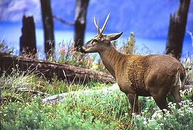 Huemul (Hippocamelus bisulcus) Este ciervo es endémico de los bosques andinopatagónicos y pastizales subandinos adyacentes del sur de Chile y Argentina. Presentaba una distribución original en Chile entre los 34-54º S desde la costa a la cordillera. En Argentina se lo encontraba entre los 36-52º S. Actualmente su distribución se encuentra bastante reducida, restringida a los sectores menos poblados y más inaccesibles para el hombre. Su hábitat óptimo lo constituyen los arbustales bajos que no superan el metro de altura, usualmente asociados a pequeños bosquetes de lenga alta. También usa en forma menos intensiva los bosques altos de lenga y los prados de altura. En la porción septentrional de su distribución, el huemul prefiere el rango altitudinal comprendido entre los 900 y los 1.400 msnm. En el verano puede ocupar también alturas mayores, hasta los 1.600 msnm, mientras que durante el invierno, suele descender en busca de sectores con menor acumulación de nieve. Asimismo, prefiere pendientes de entre 30º y 60º. Esta especie forma grupos familiares que actualmente están conformados por escaso número de individuos, usualmente un macho y una hembra con cría. Cada grupo suele utilizar unas 1.000 ha de hábitat favorable. El área de acción de cada individuo varía entre 300 y 500 ha aproximadamente. Las poblaciones actuales están formadas por pocos individuos y son parcialmente continuas en el sentido norte-sur. Se estima que entre ambos países sólo quedan algunos pocos miles de individuos. En el PNL la disponibilidad crítica de hábitat se da en invierno, donde sólo el 8% de su superficie (29.049 ha) se considera como hábitat bueno o muy bueno. Para el verano, la superficie de hábitat bueno o muy bueno asciende al 33% de su superficie (125.911 ha). 75 Sólo existen 16 registros confirmados en el PNL desde el año 1950 y sólo tres son posteriores al año 1992. Se estima que actualmente una sola población existiría en el Parque Nacional, en la zona de Reserva Natural Estricta ubicada al oeste del lago Queñi, la cual ocupa sólo el 0,5% del área protegida. Además podría estar presente en otros cordones montañosos compartidos con el PN Nahuel Huapi en Paso Córdoba, en Villarino y Falkner y en el O del lago Hermoso. No existen registros recientes de huemul en el territorio chileno adyacente a los Parques Nacionales Lanín y Nahuel Huapi, aunque existen en cercanías de Hua Hum, poblaciones en semicautiverio, en el sector de Huilo Huilo en un Fundo privado administrado por una ONG.
